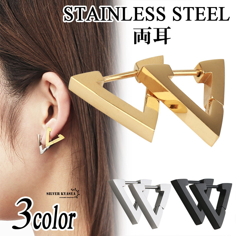 - (ゴールド) 両耳 ステンレス 316L トライアングルピアス ゴールド フープピアス シルバー ブラック 三角ピアス 2点セット