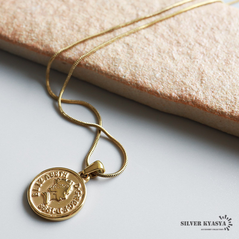 > (45cm) コインネックレス スネークチェーン アンティーク エリザベス女王 ゴールド 18K ステンレス 金属アレルギー対応