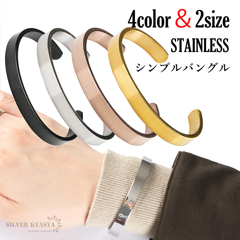 > (シルバー、L) 316L ステンレスバングル 平打ち バングル ブレスレット 金 シルバー ブラック 4color