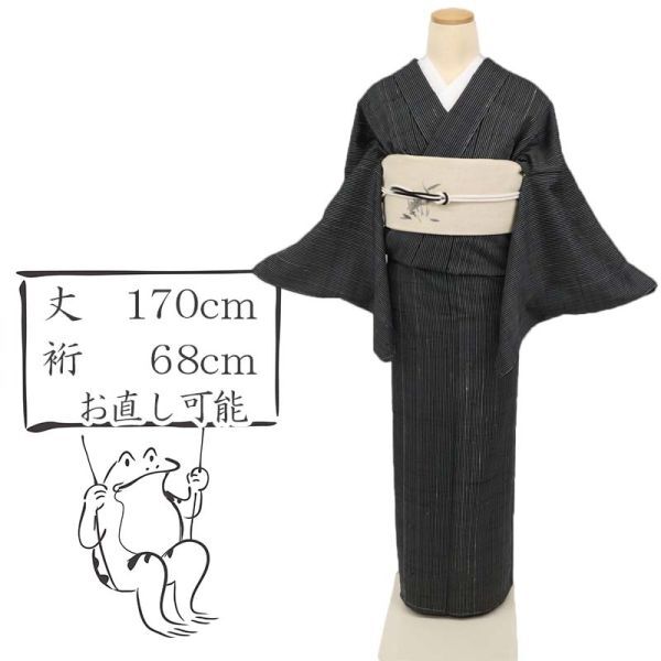 > 【紬】 長尺 特選 細やか縞の織り模様 黒白モノトーン 袷正絹着物 TB12-9