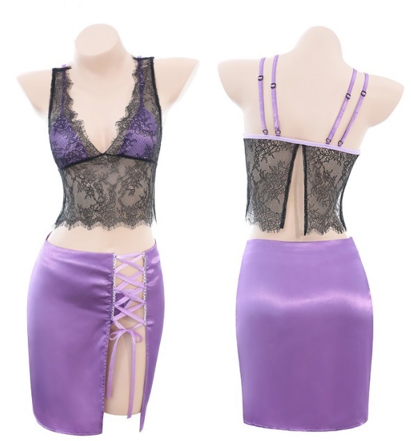 - 新作 セクシーセット 深V露乳 シースルー パジャマ ベビードール ミニスカート 紫