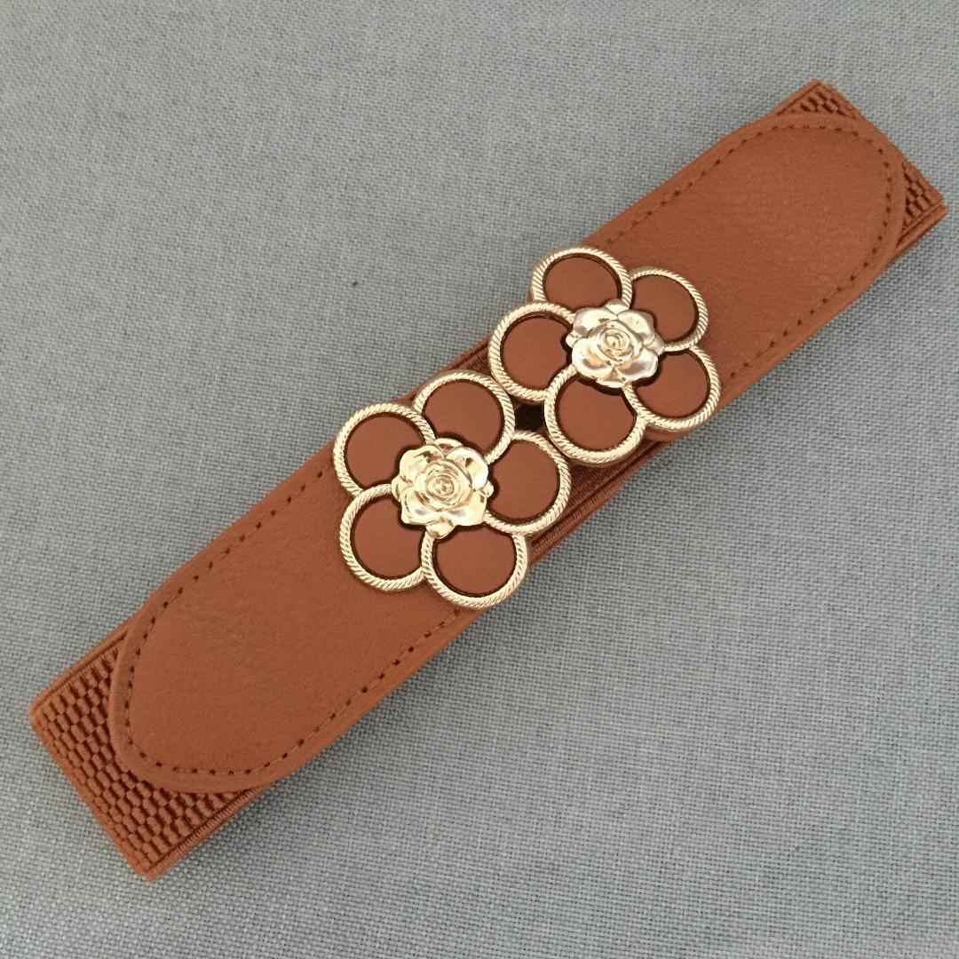 - 【ブラウン】約4cm【花柄 ゴムベルト】レディース ゴムベルト ゴールド 金