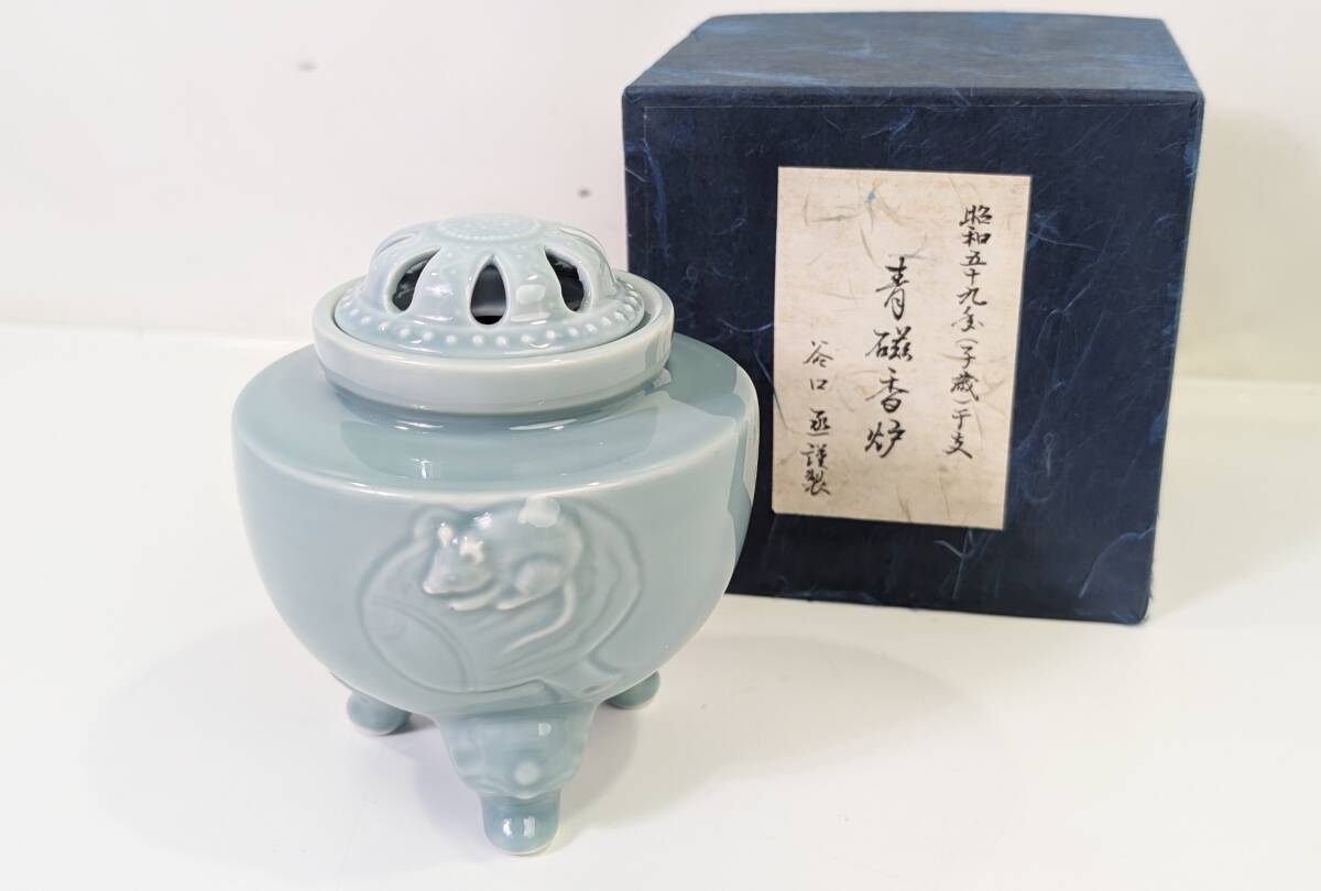 - 谷口 丞 謹製 青磁香炉 昭和五十九年(子歳)于支 高さ約13cm