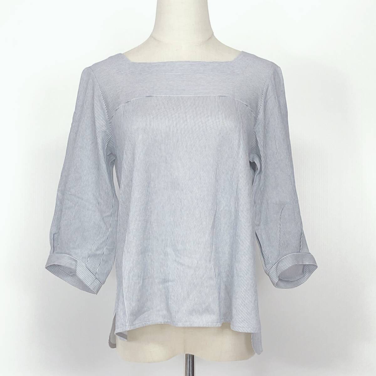 > YX819Airpapelレディーストップスカットソー七分袖薄手Mサイズホワイト白インディゴ 青 ストライプ コットン100% ガーリーベリースタイル
