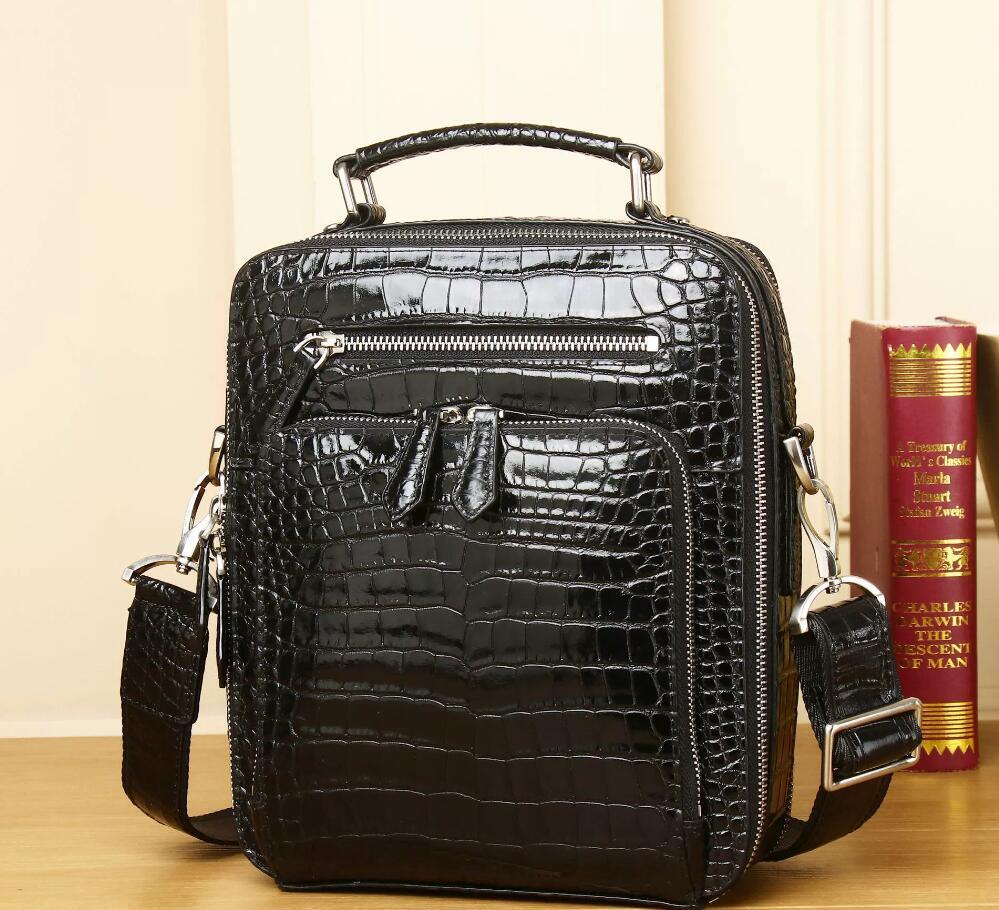 - 新品未使用新作艶あり多機能斜めがけクロコダイル本革ワニ革メンズショルダーバッグ肩掛けメッセンジャーバッグ腹部革センター取りブラック