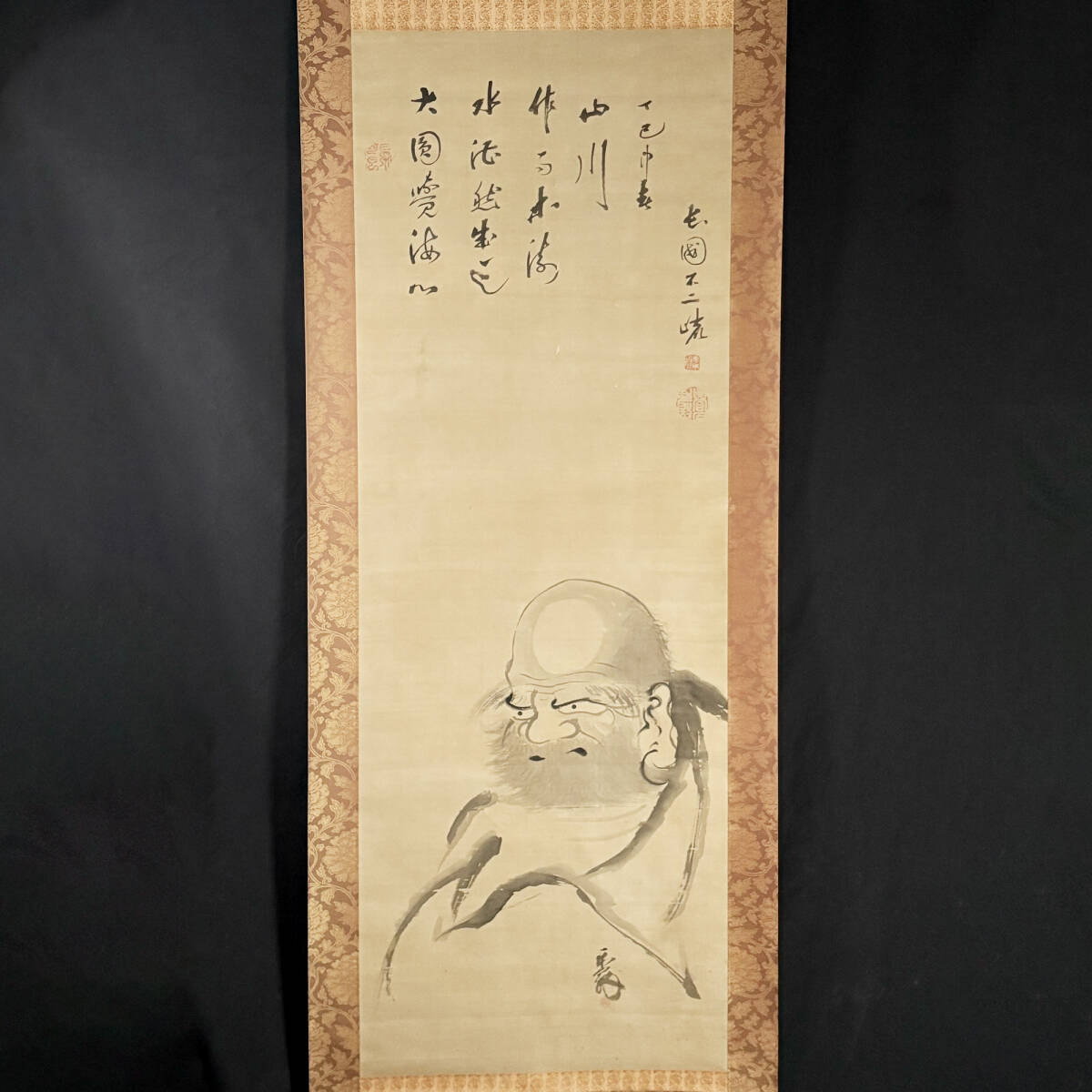 - 【模写/古画】■ 松平定信(画)/覚巌寂明(賛) ■ 「達磨図画賛」極札添/絹本 色紙軸装 250218001
