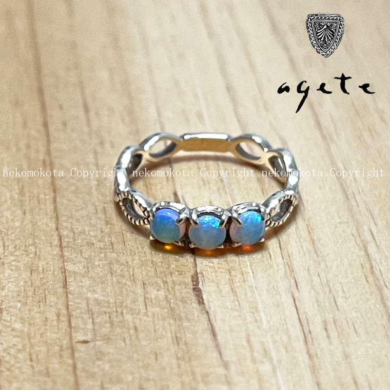 > アガット K10 オパール 3石 カラーストーン 透かし リング 3号 指輪 天然石 ピンキーリング ライトグリーン アクセサリー agete