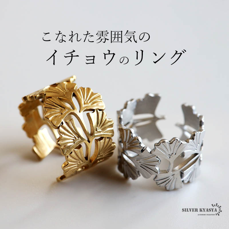 > (シルバー) ステンレス イチョウリング リーフリング 銀杏 葉 ゴールド 18K GP フリーサイズ 女性 金属アレルギー対応