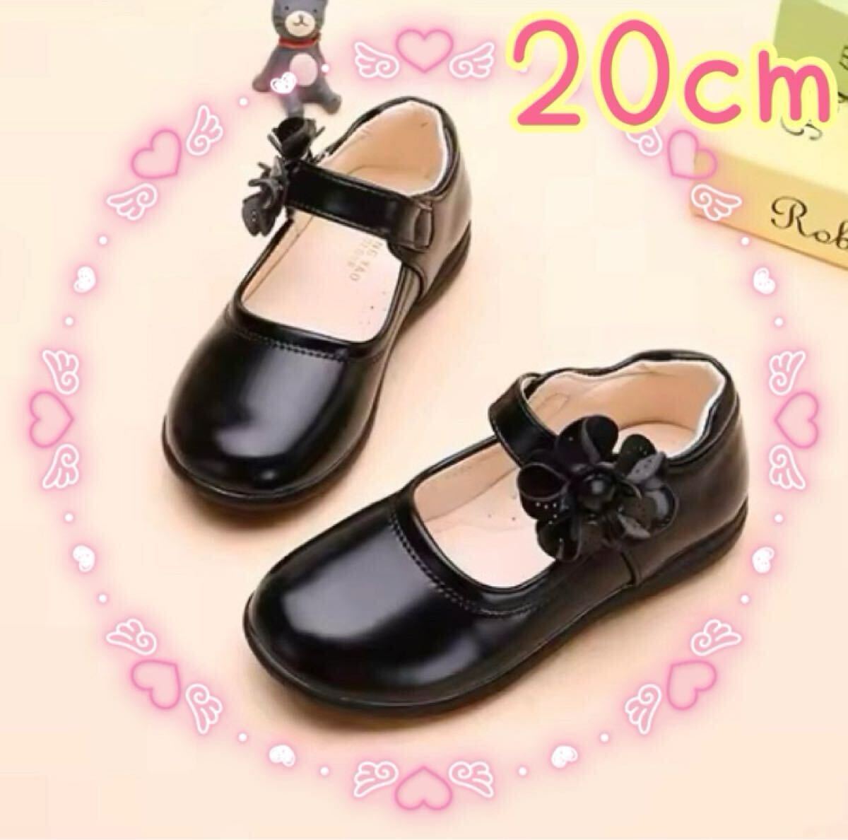 - フォーマルシューズ 20cm ブラック キッズ 子供靴 フラット ストラップ お花 結婚式 発表会 入学式 卒業式
