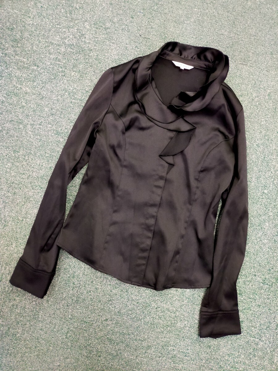 - サテン調生地 光沢ブラック 首元フリル シャツ・ブラウス