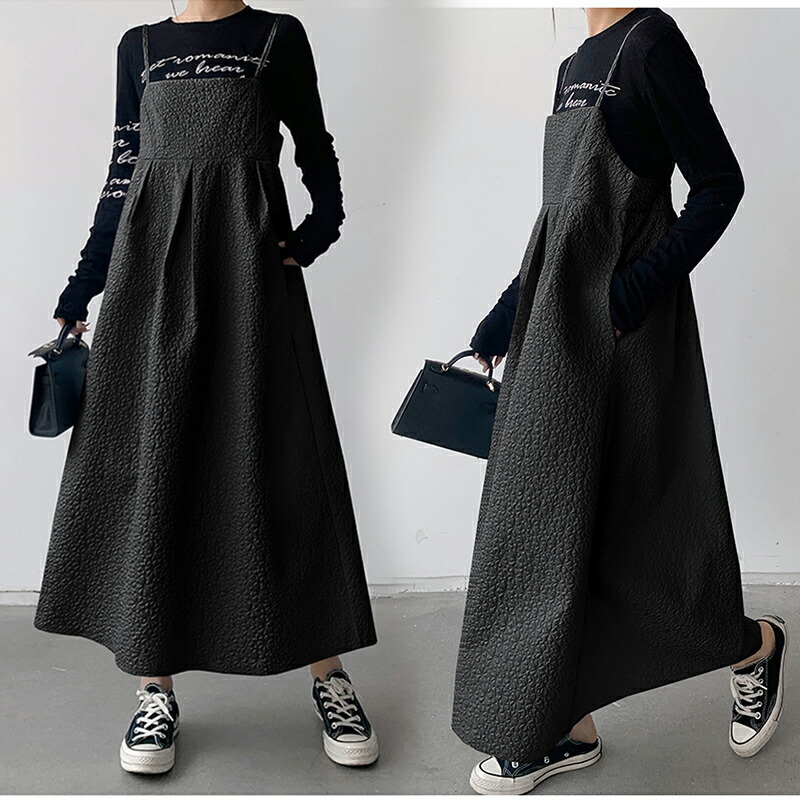 - 【新品】キャミワンピース ブラック エンボス加工 ロング M