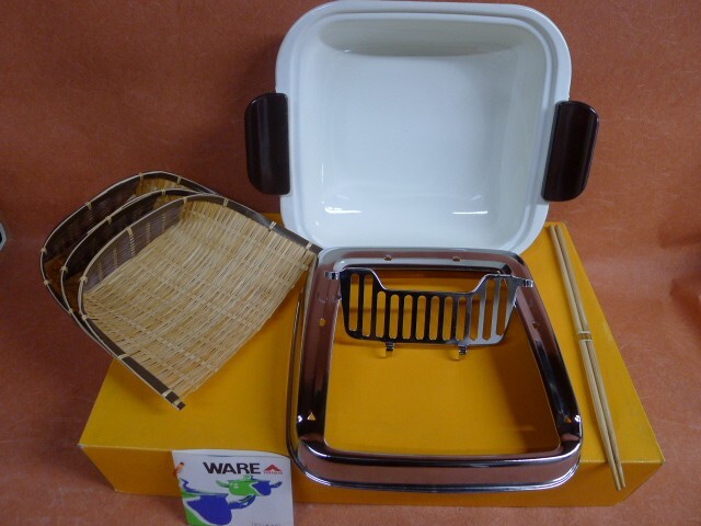 - b◆420 ware 山広 天ぷら鍋 角型 揚げ物ホーローセット(盆ざる3枚・竹箸1繕付き)/100