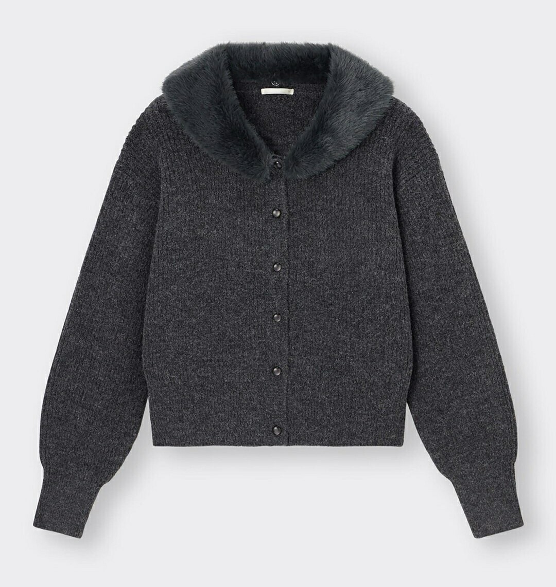 > Lサイズ 新品 フェイクファーカラー(取り外し可能) カーディガン ダークグレー GU 長袖 ニットカーディガン ジーユー