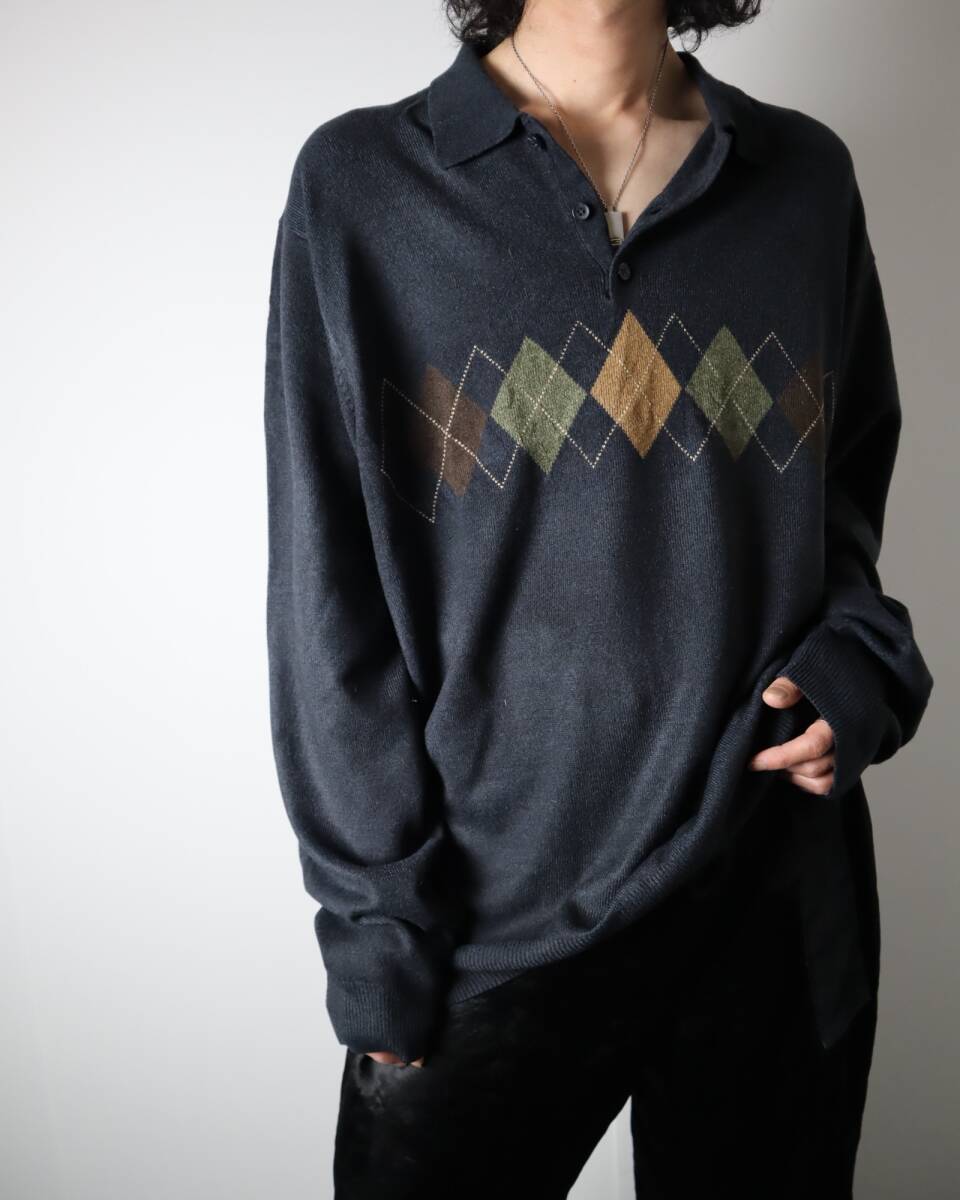 > K417 DOCKERS argyle pattern oversized knit polo ドッカーズ アーガイル チェック柄 ハイゲージ ルーズ 長袖 ニットポロ XXL