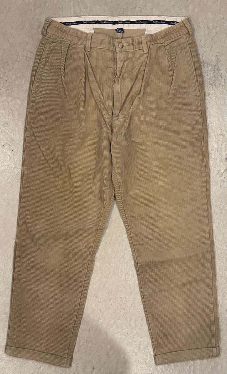 > 【90s】POLO RALPH LAUREN ポロラルフローレン コーデュロイパンツ ツータック テーパード メンズ W38 ベージュ 太畝 vintage 古着 正規 ⑦