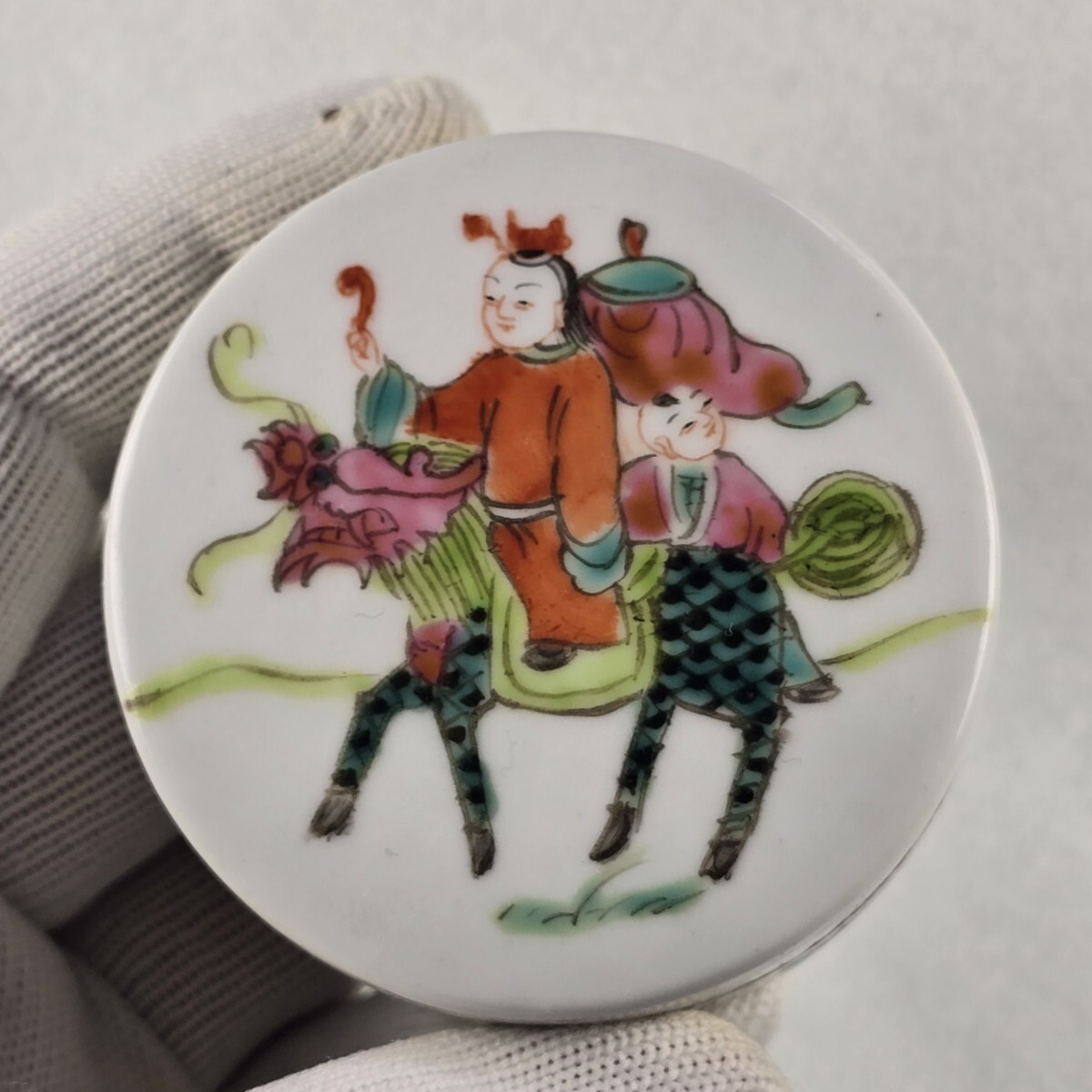 - 希少 古磁 粉彩 手描き 民国居仁堂在銘 麒麟天官送子紋 香合 墨箱 美品