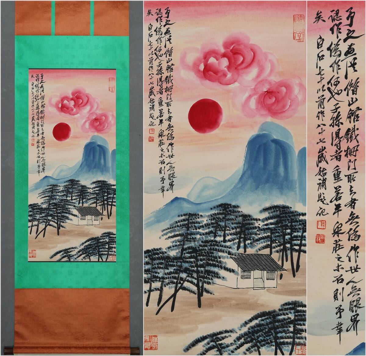 - 古美術 掛け軸 中国・近現代 「斉白石書」 紙本 【夕日紅霞図】 立軸 書道 巻き物 肉筆保証 唐物 古画 画心104x48cm LT-250364