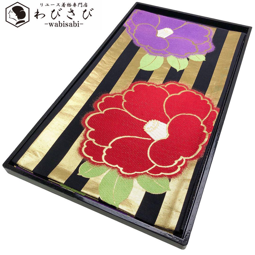 > 袋帯 縦縞模様 椿の花柄 黒色 振袖 O-4823 着物 きもの kimono 和服 和装 中古 リサイクル着物 【送料無料】