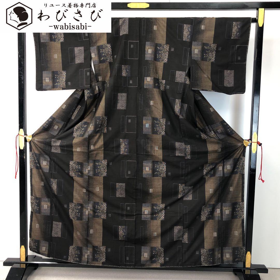 黒色ベースの雰囲気の良い泥染、四角に花模様、八掛には木兎に兎がデザインされた素敵な柄裄のお品でございます。
