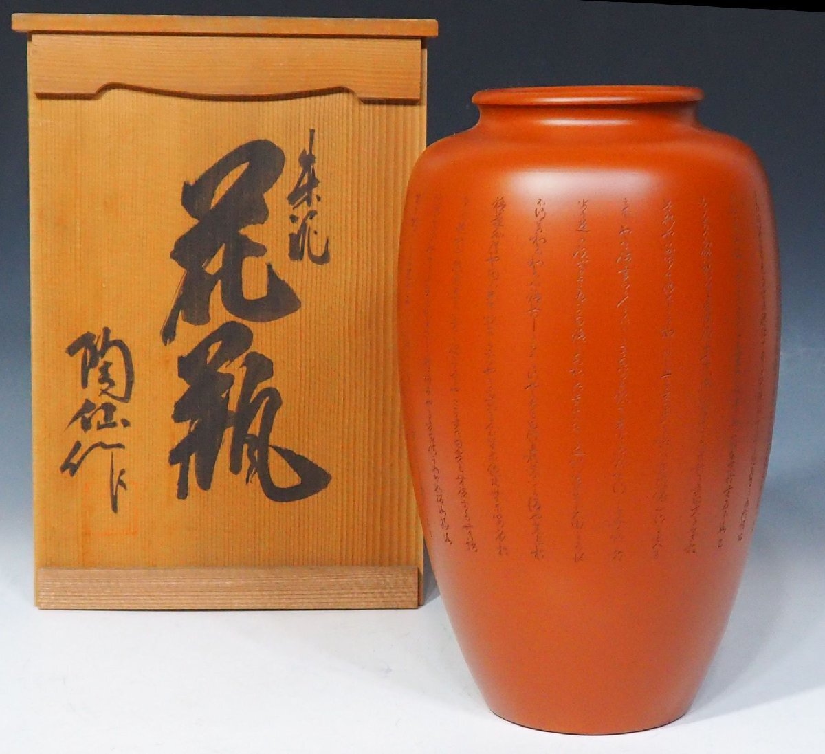 > ● 常滑焼 【 漢詩彫 朱泥 花瓶 】陶仙 ≪細密彫刻≫ 共箱 花入 華道 未使用|《常滑焼買取 小川処堂》