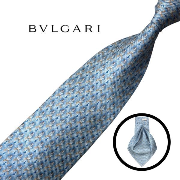 > ★セッテピエゲ★ハット柄★BVLGARI 高級ネクタイ スカイブルー系 総柄 イタリア シルク プレス済み USED t1374