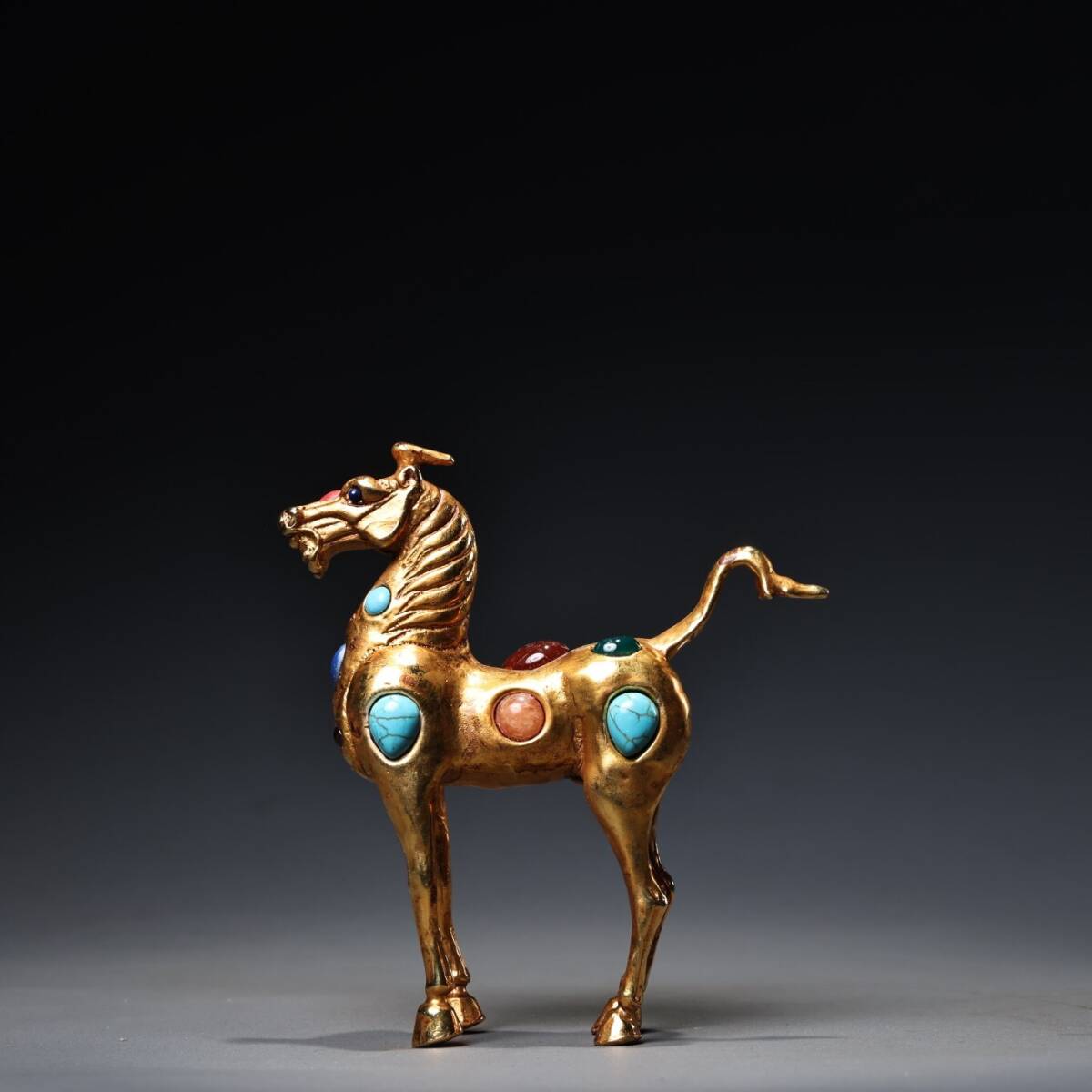 - 【仁】『銅製・塗金・寶石嵌・馬到成功・置物・賞物』極細工 古賞物 中国古玩 古美術 古美味