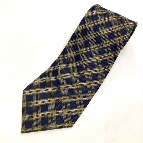 - 良品 DAKS ダックス チェック柄 ネクタイ シルク 絹 100 ネイビー イエロー