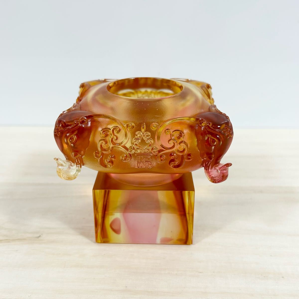 > 定価約120000円 琉璃工房 大平和 限定3200個 置物 中国美術 アンバー ゴールドレッド クリスタルガラス パテ・ド・ヴェール ガラス工芸