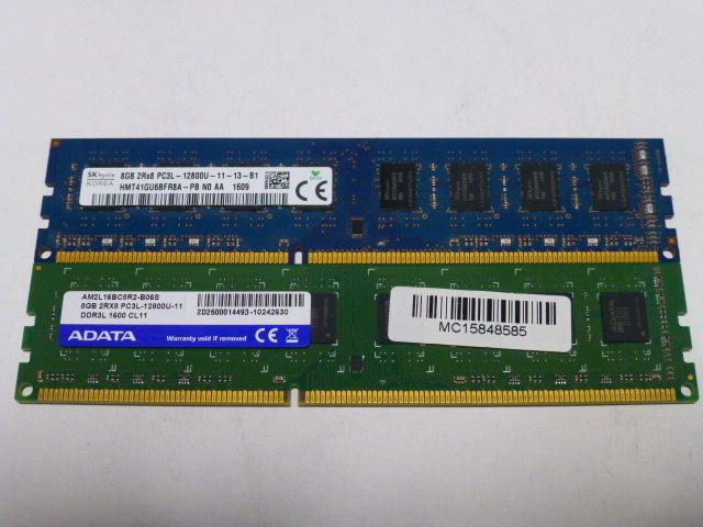 > メモリ デスクトップパソコン用 SK hynixとADATA 1.35V DDR3L-1600 PC3L-12800 8GBx2枚合計16GB 起動確認済みです