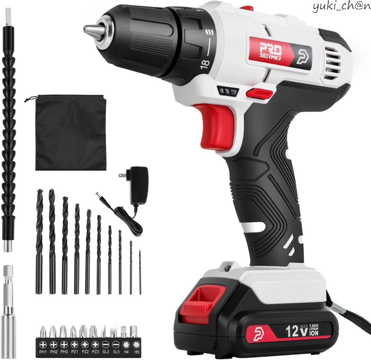 - 電動ドリル 12V 充電式 電動ドリルドライバー 正逆転切替 18+1段階トルク 最大30N.m 1500mAh LEDライト