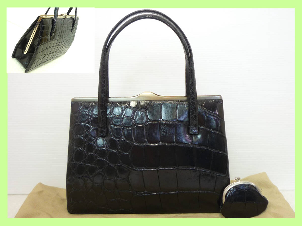 > シャイニング クロコダイル レザー ハンドバッグ 小銭入れ 袋付 セット 型押し 本革 ワニ革 黒 高級感 光沢 華美 着物 パーティ_C(検:JRA