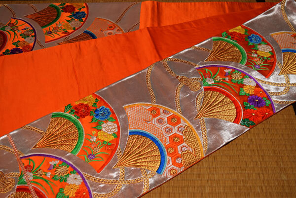- 正絹 長さ短め 扇柄 花 袋帯 -六通-