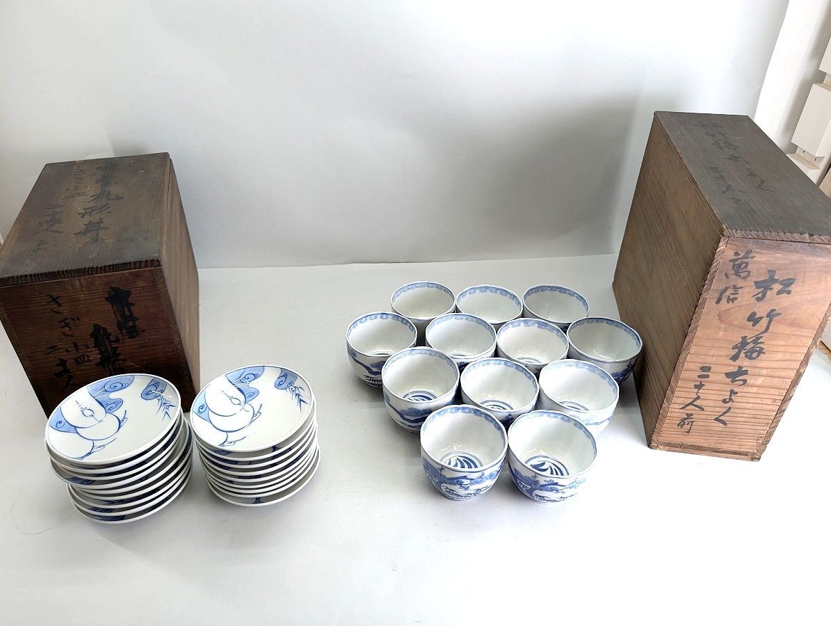 - 大正時代 萬信 さぎ小皿 18枚・松竹梅ちよく 12客 まとめて 当時物 不揃い 共箱付[03-5668