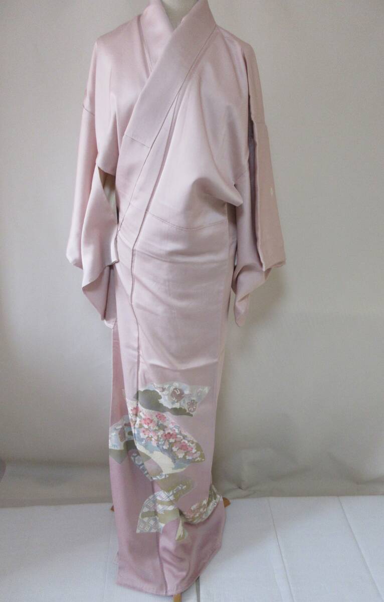 - 49-4 和装 着物 ピンク 三つ紋 和服 身丈約151㎝ 梅 紅葉