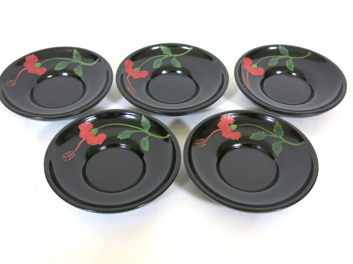 - 琉球塗 ★浮彫り花図 茶托 5枚組 (黒) ★直径12cm