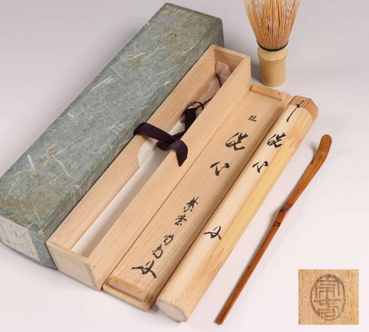 - 【CM91】茶道具 龍源院住職 細合喝堂 銘「洗心」竹茶杓 下削・奥田宗春