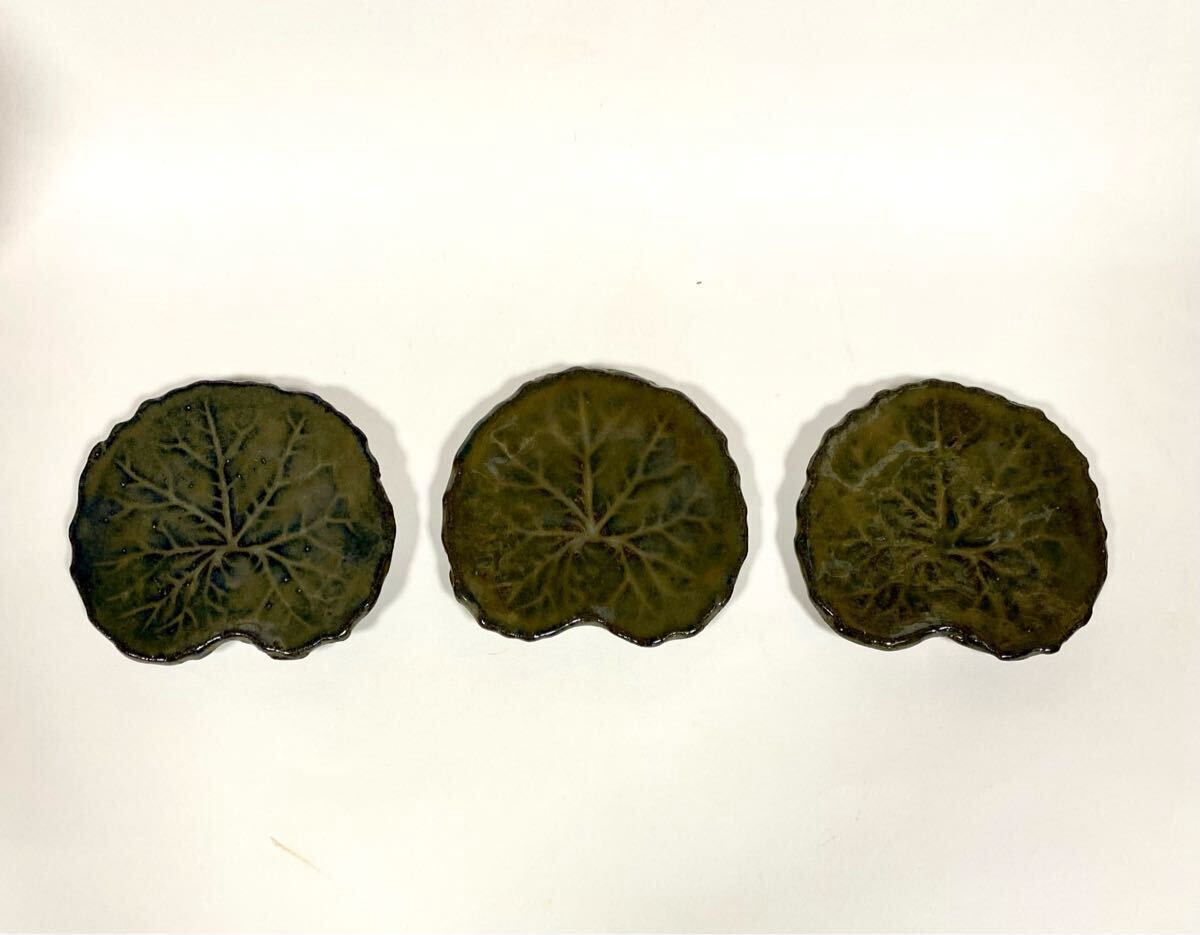 - 民陶『会津本郷焼 蕗形3寸皿 3枚セット 「陶雅」在名 (径10.2cm) 陶雅陶楽 伝統の温もり 3足付』民芸 灰釉 葉形皿 小皿 銘々皿 豆皿 レトロ