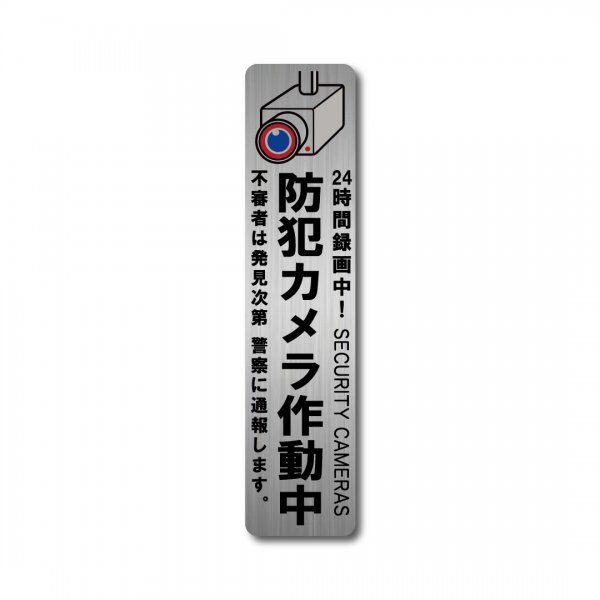 > カメラ監視中 防犯ステッカー シルバー 縦型 ヘアライン マット 新品 W35mmxH150mm 国内生産 屋外 耐水 侵入防止 セキュリティー