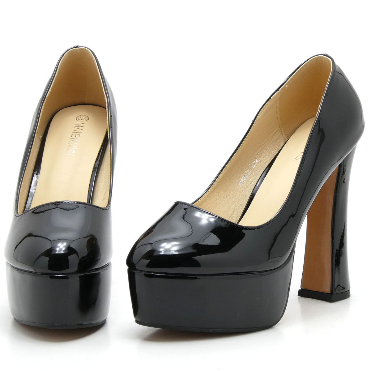 - 新品 大きいサイズ パンプス ブラック 27.5cm 131420-45 エナメル調 前厚底ストーム ハイヒール 太ヒール