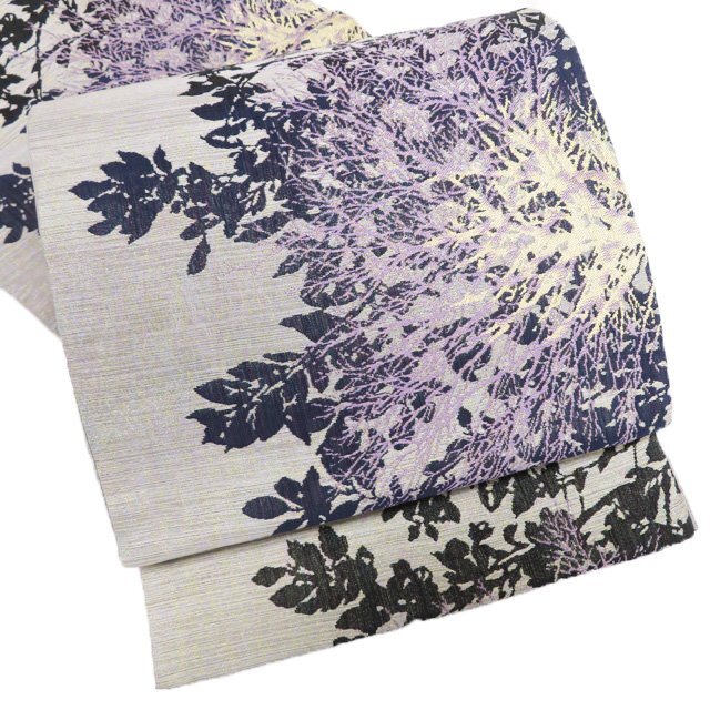 - 袋帯 未使用 正絹 カジュアル 仕立て上がり 六通 樹木の図 箔糸 金通し 霞色 濃紺色 多色 金 きもの北條 A1168-13