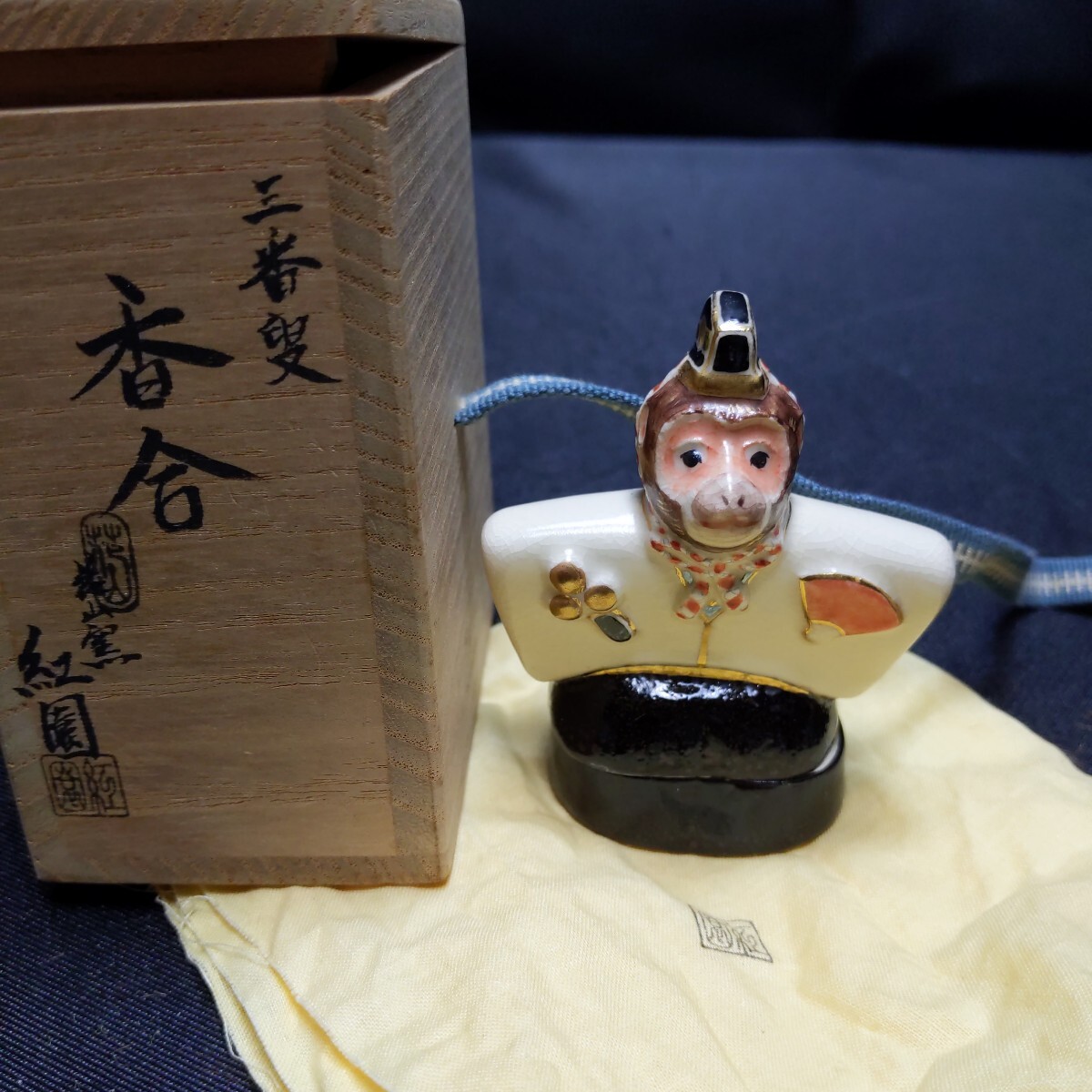 - 431 香合 三番叟 花山窯 紅園 香道具 陶器製 木箱 共箱 共布 3×5×8cm