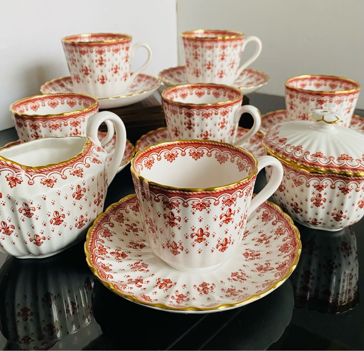 - 新品◆英国 SPODE スポード FLEUR DE LYS/フルール ドリス レッドゴールド 赤 カップ&ソーサー 6客セット シュガーポット クリーマー