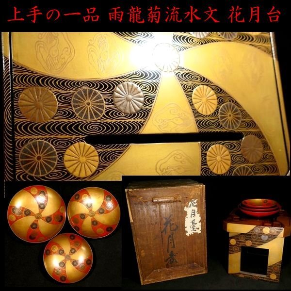 【 恵 #1605 】 上手の一品 雨龍菊流水文 見事な金蒔絵の杯台 花月台 酒盃 木製 内梨地 共箱あり 検:金蒔絵/茶道拍卖