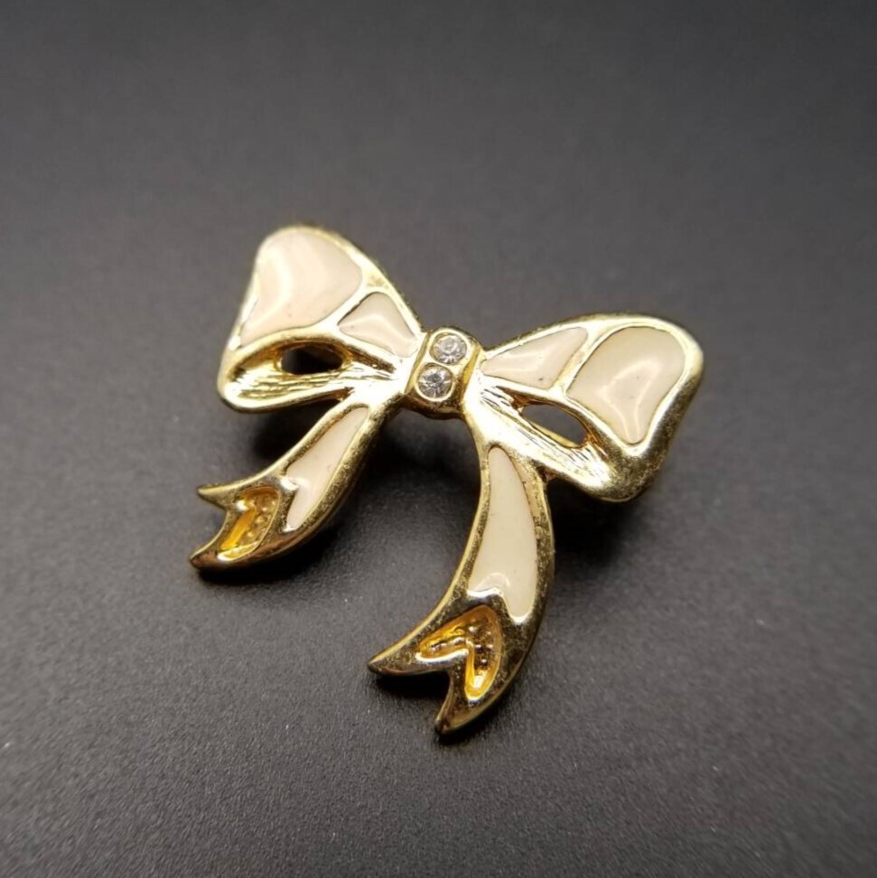 > クリーム色のリボン エナメル装飾 ラインストーン ヴィンテージ ブローチ ゴールドトーン レトロ キュート ワンポイント 小ぶり Y22-H