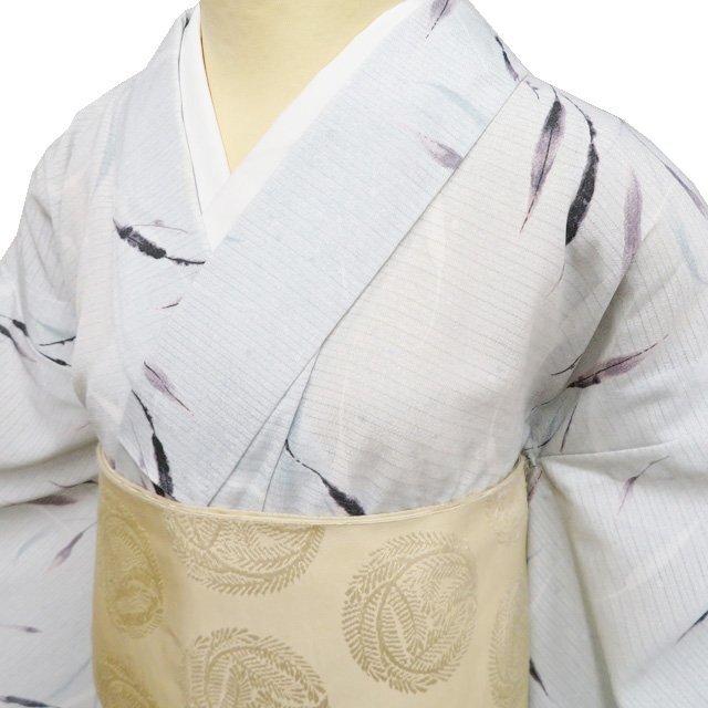 > 夏物 小紋 着物 中古 ポリエステル カジュアル 植物文様 葉っぱ模様 薄水色 多色 身丈151.5cm 裄64.5cm SA きもの北條 A1172-3
