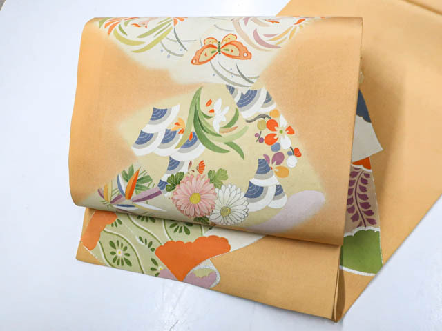 - 《古美術京松》【着物】アンティーク 丸帯 袋帯 金銀彩 お太鼓柄 花の本文 r7b01-13a