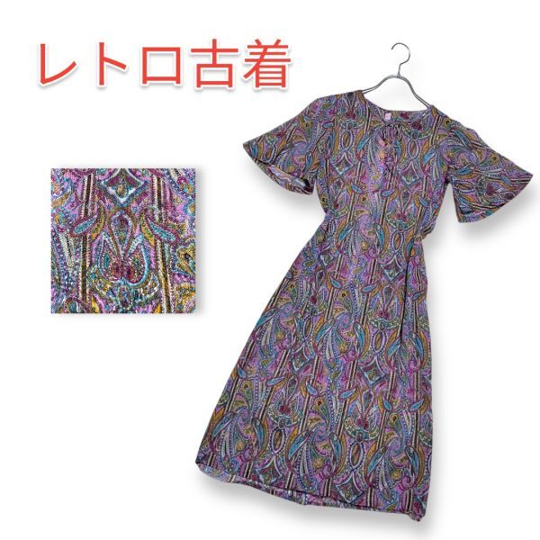 > 【レア】昭和レトロ ワンピース サイケ 総柄 ペイズリー 透け感 ヴィンテージ ゆったり エレガント オートクチュール 特注品 匿名配送