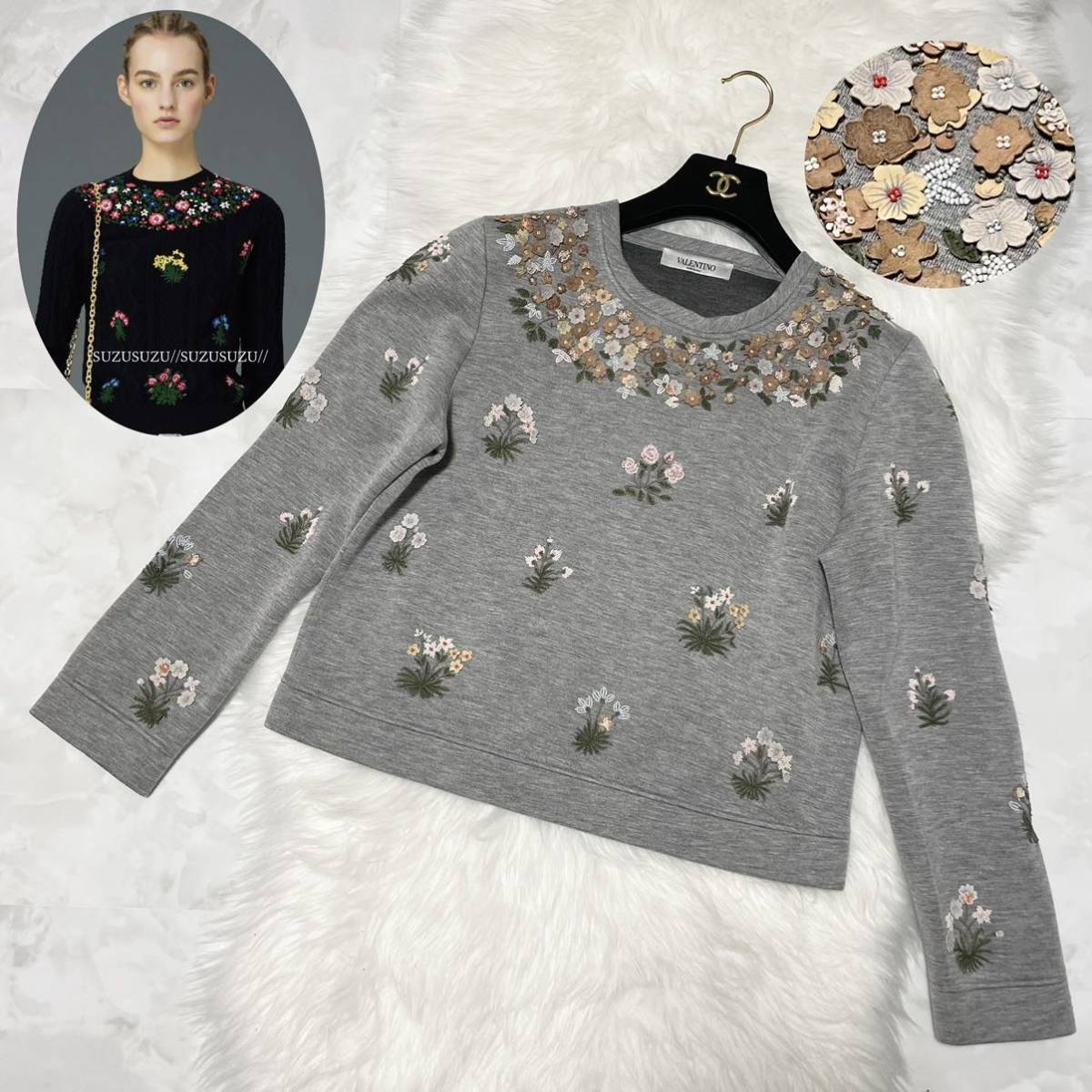 - 本物 名作 ヴァレンティノ 最高級ライン 花柄 フラワー装飾 ビーズ刺繍 長袖 スウェット トレーナー L グレー VALENTINO ヴァレンチノ