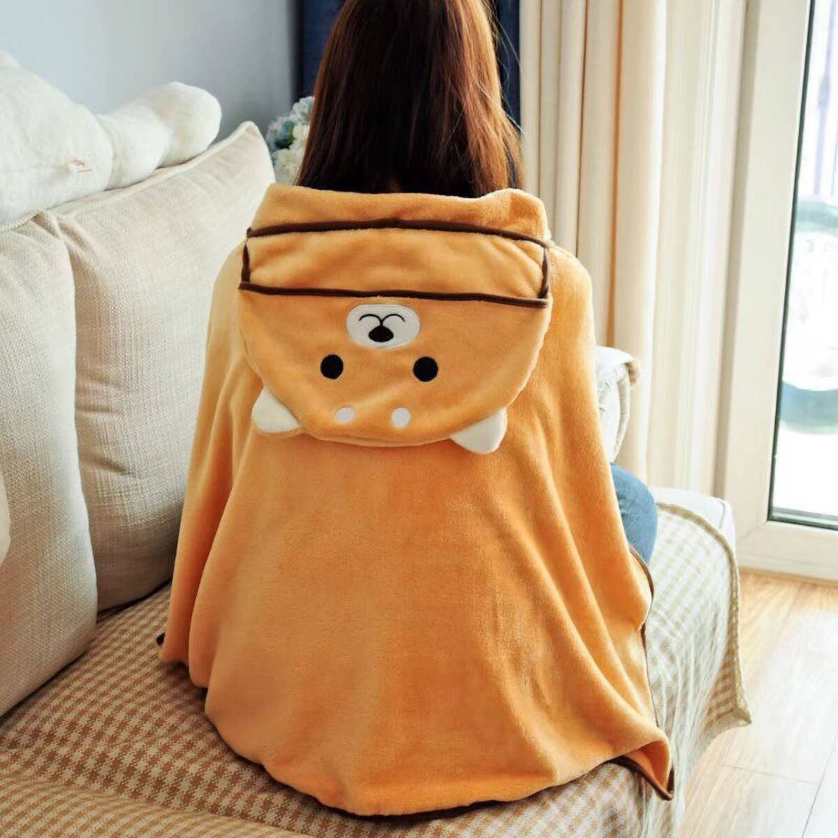 - 【新品】膝掛け フード付き ブランケット コンパクト 携帯ブランケット 柴犬 W95H80cm ブラウン