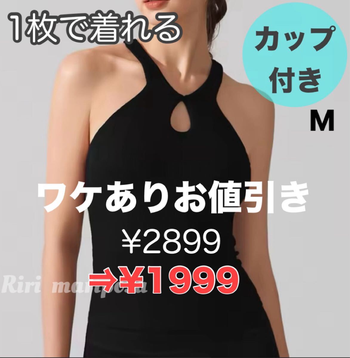 - ティアドロップネック*リブニット タンクトップ ブラックMサイズ スポーツ ヨガウェア 黒